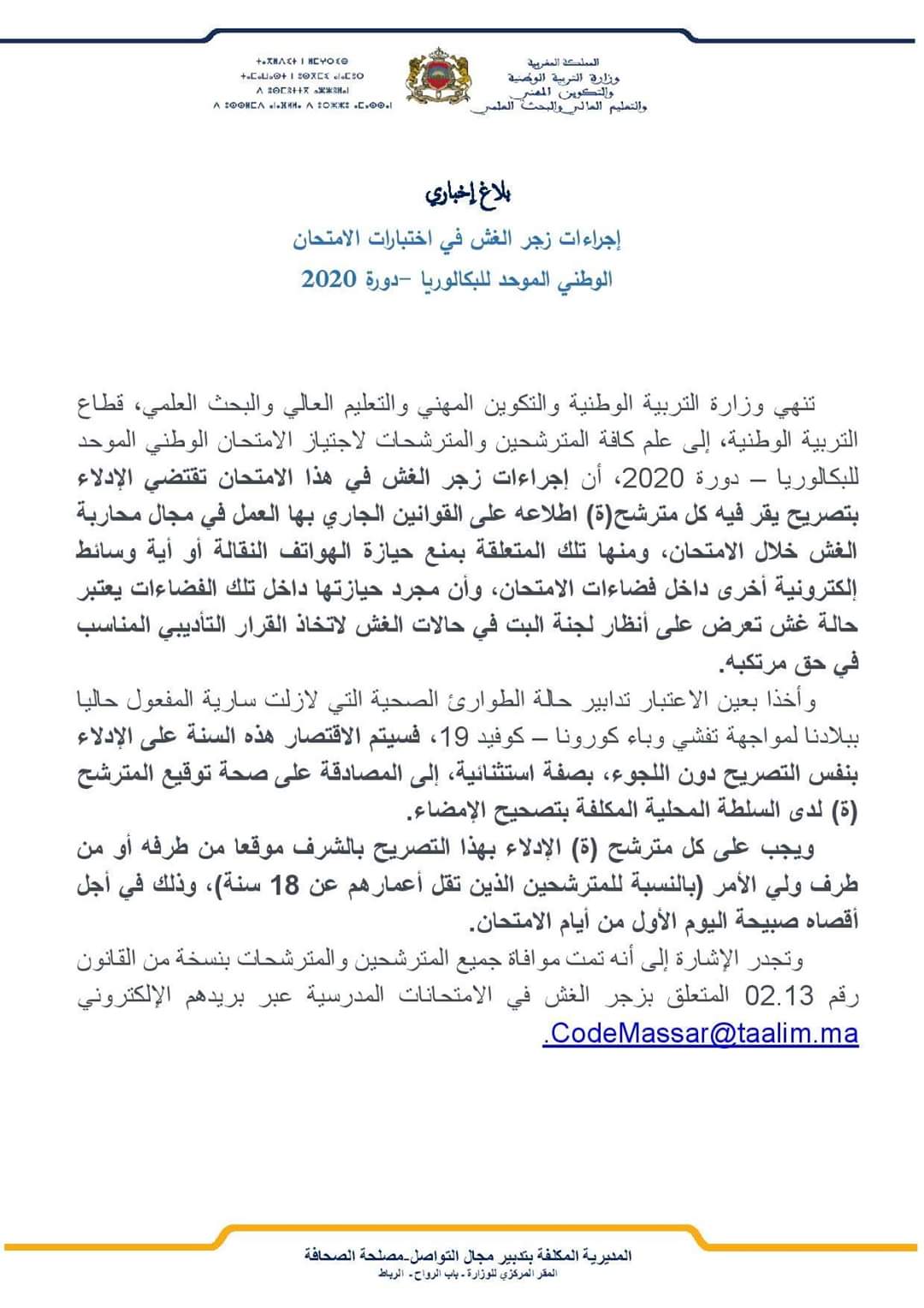 وزارة التربية الوطنية إجراءات زجر الغش في اختبارات الامتحان الوطني الموحد لامتحانات البكالوريا دورة 2020